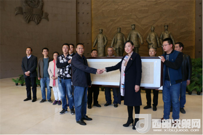 西部決策網——西部大開發(fā)訊(帥華鋒 通訊員 柴金霞 陳彥榮)“三月的南梁,大地處處蕩漾著春的漣漪.....”在這生機勃勃、春意盎然的美好時節(jié),中國書法家協會會員、首屆《世界華人運動大會書畫展》楷書評委、清心齋主人趙倉老師一行,帶著對革命老區(qū)的深情厚誼和對劉志丹、謝子長、習仲勛等革命先輩舍生忘死、救民出水火的崇敬之意來到革命圣地——南梁,向紀念館捐贈書法作品《長恨歌·習仲勛》。本作品系趙倉老師艱辛創(chuàng)作的佳品力作,飽含了趙倉老師豐厚的文化內涵,真實再現了習仲勛老人不畏艱難、矢志堅守的人生壯麗詩篇。