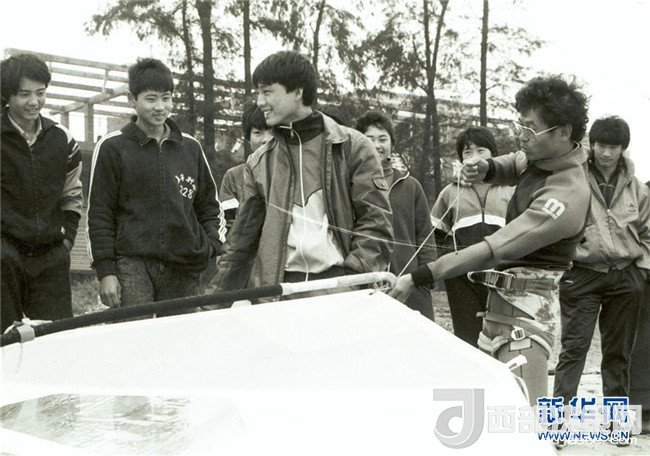 來(lái)自臺(tái)灣的帆板運(yùn)動(dòng)員在??诤彤?dāng)?shù)厝罕娊涣鳎?989年1月16日攝)。新華社記者 姜恩宇 攝