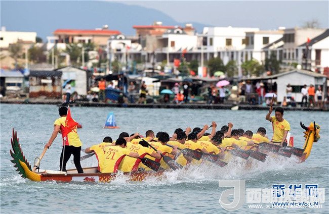 選手參加在萬(wàn)寧和樂(lè)鎮(zhèn)港北港舉行的2016中華龍舟大賽萬(wàn)寧站200米直道賽決賽(2016年3月10日攝)。新華社記者 楊冠宇 攝