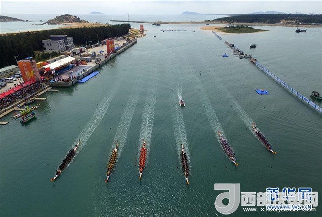 運(yùn)動(dòng)員參加在海南萬(wàn)寧和樂(lè)鎮(zhèn)港北港舉行的2016中華龍舟大賽萬(wàn)寧站比賽(2016年3月10日無(wú)人機(jī)拍攝)。新華社記者 楊冠宇 攝