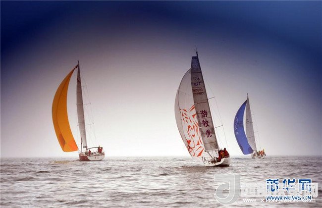 參賽賽船在2016年第七屆環(huán)海南島國(guó)際大帆船賽三亞-??诶惖谋荣愔校?016年3月14日攝)。新華社記者 楊冠宇 攝