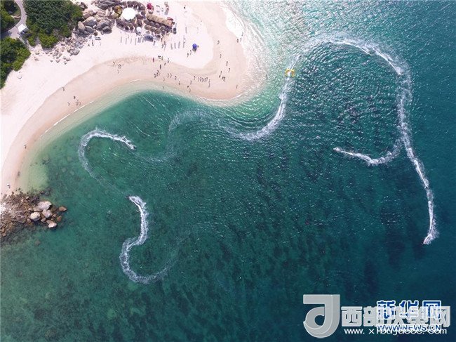 在三亞蜈支洲島參加2016動(dòng)力沖浪板國(guó)際賽中國(guó)站的選手在比賽中(2016年9月18日無(wú)人機(jī)拍攝)。新華社記者 楊冠宇 攝