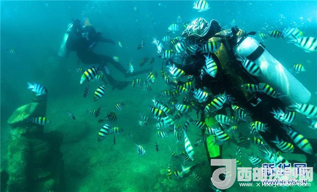由教練帶領(lǐng)的潛水愛(ài)好者在海南省分界洲島附近海域下潛(2017年5月1日攝)。新華社發(fā)(童國(guó)強(qiáng)攝)