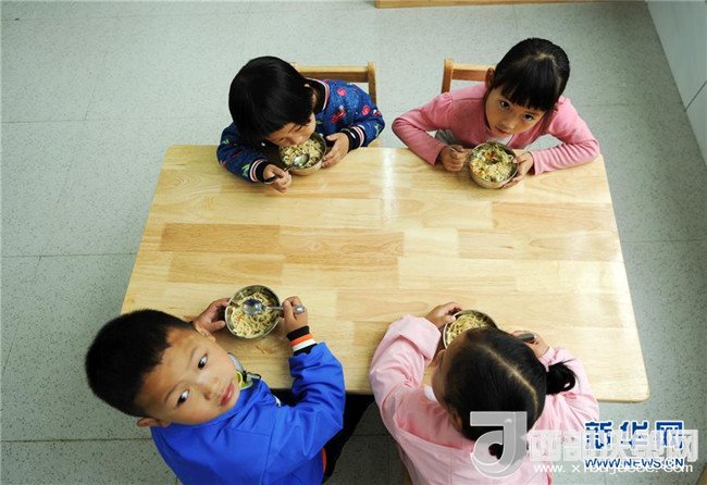 4月23日,吉雪(后排右)和小朋友們?cè)谛陆淌依锍栽绮汀?br />