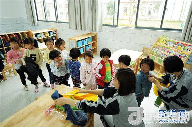 4月23日,吉雪(左一)和小朋友們?cè)诎仓命c(diǎn)的學(xué)校教室內(nèi)排隊(duì)等待老師發(fā)放新校服。