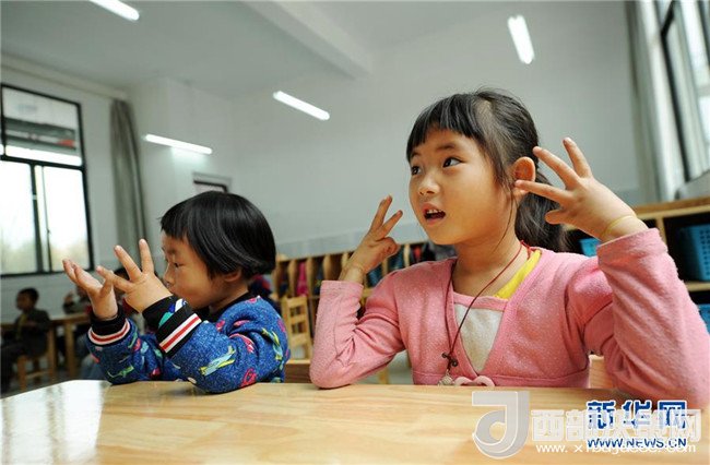 4月23日,吉雪(右)在課堂上跟著老師做游戲。