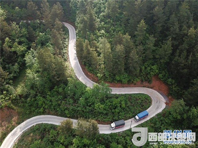 4月22日,幫助吉雪家搬家的貨車行駛在鄉(xiāng)村公路上(無(wú)人機(jī)拍攝)。