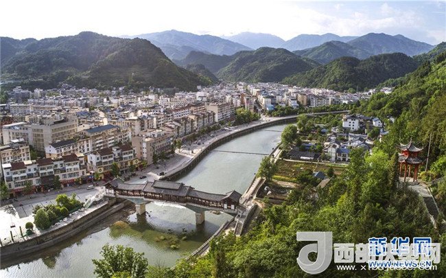 新青川縣城喬莊河上興建的感恩廊橋(4月25日無人機拍攝)。新華社記者陶明攝