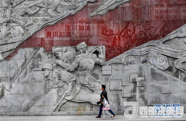 4月26日,市民從感恩奮進墻前走過。感恩奮進墻是花崗巖浮雕墻,長230米,高12米,再現了青川的風土人情、歷史文化和眾志成城、自強不息的抗震救災精神、地震災后重建和生態(tài)青川的壯美畫卷。新華社記者陶明攝