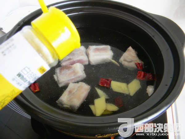 3.砂鍋放水,水的量掌握好,放入排骨,姜,辣椒和胡椒粉。