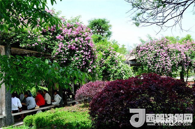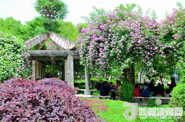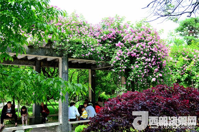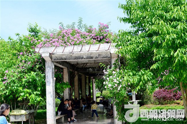 5月1日,市民正在寧強(qiáng)縣縣城三角洲公園里的薔薇花下納涼賞花。