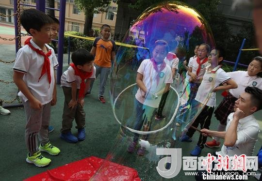 孩子們體驗(yàn)被泡泡罩住的感受?!°蟛?攝