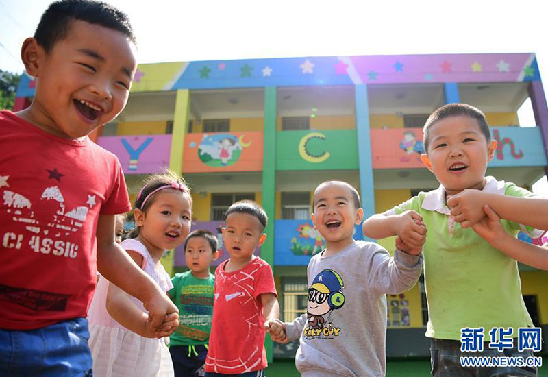 陜西省安康市漢濱區(qū)雙龍鎮(zhèn)杜壩村五四小學(xué)附設(shè)幼兒園小朋友們?cè)诓賵?chǎng)上做游戲(2017年6月16日攝)。這個(gè)幼兒園使用貸款資金翻修改造而成,有效解決了該村及周邊兒童學(xué)前教育缺失的問(wèn)題。新華社記者 邵瑞 攝