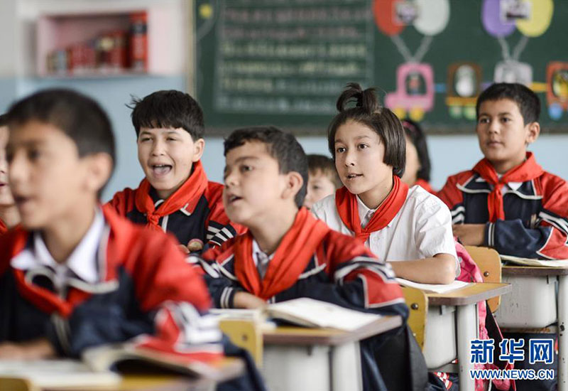 新疆疏附縣托克扎克鎮(zhèn)中心小學(xué)5年級(jí)1班同學(xué)們?cè)谏险n(2017年9月26日攝)。新華社記者 趙戈 攝
