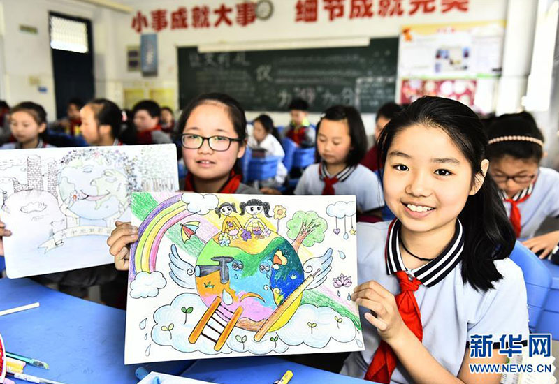 合肥市蜀山區(qū)井崗鎮(zhèn)新城小學(xué)學(xué)生展示自己在“善待地球,童繪藍(lán)天——我與地球的故事”繪畫(huà)活動(dòng)中的作品(4月19日攝)。新華社發(fā)(葛宜年 攝)