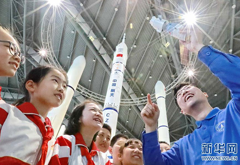 在河北秦皇島軍界·秦皇島軍事科學(xué)教育VR基地,秦皇島無(wú)線電管理局工作人員為海港區(qū)新一路小學(xué)學(xué)生講解無(wú)線電在航天領(lǐng)域的應(yīng)用(4月23日攝)。新華社發(fā)(曹建雄 攝)