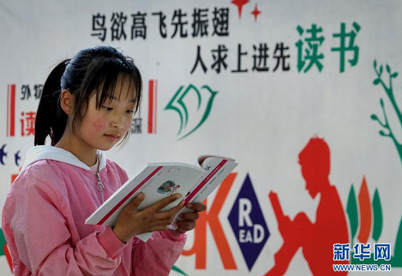 河南焦作市博愛(ài)縣寨豁鄉(xiāng)小學(xué)學(xué)生郭艷冰在校內(nèi)閱讀從“焦作市圖書(shū)館館外流通點(diǎn)”借閱的書(shū)籍(4月18日攝)。新華社記者 李安 攝