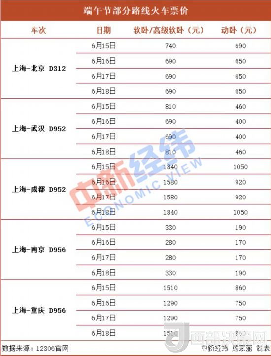其中,端午節(jié)前一日(15日)和最后一日(18日)的火車票價(jià)格較高,與16日、17日相比,要高出20-260元不等。以上海-成都D952車次為例,15日高級軟臥票價(jià)比16日高出260元,15日動(dòng)臥票價(jià)比16日高出130元。因此,建議有條件的小伙伴提前或延后出行。