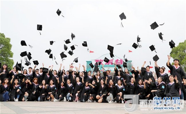 6月10日,畢業(yè)生們?cè)跉g樂谷廣場(chǎng)上拍合影。新華社記者 方喆攝