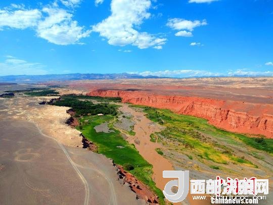 站在天山紅河谷入口處的斷崖邊,可以清晰地看到遠(yuǎn)處的天山,天然的紅土飄帶,一簇簇的綠蔭,坐落有致的農(nóng)家院落?;臎龅母瓯谂c斷崖下的美景,給人以強(qiáng)烈的視覺沖擊。紅色的山巖,猶如一條鑲嵌在天際間的飄帶而光彩奪目,河谷內(nèi)寧靜的村莊透露著幾分神秘。