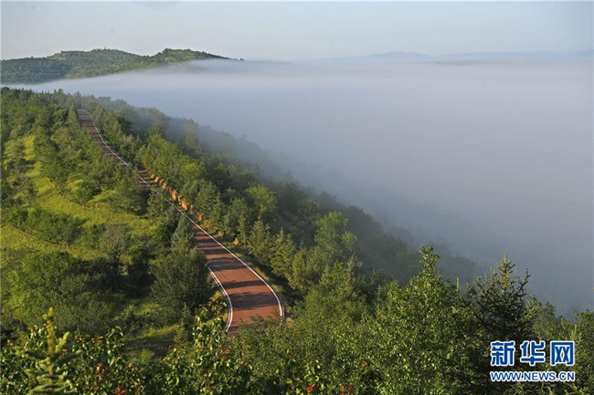 云霧繚繞的寧夏彭陽縣金雞坪梯田公園(7月17日攝)。新華社記者王鵬攝