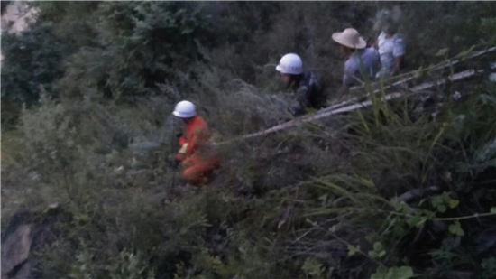 接到報(bào)警后,大隊(duì)及專職隊(duì)迅速出動(dòng)兩輛消防車和10名官兵趕赴現(xiàn)場(chǎng)進(jìn)行處置,到達(dá)現(xiàn)場(chǎng)后,指揮員迅速帶領(lǐng)4名戰(zhàn)斗員立即對(duì)險(xiǎn)情進(jìn)行偵查。通過(guò)現(xiàn)場(chǎng)偵查,發(fā)現(xiàn)在距離路面高約50米的山梁上,幾個(gè)石塊直徑約1米大小,由于連續(xù)幾日暴雨,石塊下土層已經(jīng)流失,導(dǎo)致石塊部分懸空,隨時(shí)都有掉落的危險(xiǎn)。此時(shí)已近夜晚,模糊不清的環(huán)境無(wú)形中增加現(xiàn)場(chǎng)處置的難度。指揮員下令,分兩組進(jìn)行處置,一組由5名戰(zhàn)斗員跟隨一名熟悉該山道路的群眾一起上山,處置"懸石”險(xiǎn)情,一組與交警部門拉起警戒線隔離過(guò)往車輛和行人。由于“懸石”處無(wú)路可通,戰(zhàn)斗員在上到山梁后,系上安全繩下降到懸石旁利用事先準(zhǔn)備好的鋼釬對(duì)石塊進(jìn)行起拗,在經(jīng)過(guò)兩個(gè)多小時(shí)的作業(yè)后,全部懸石終于掉落路面,使隱患徹底消除。