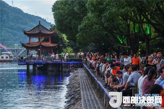 7月23日,在浙江建德,市民和游客在新安江畔休閑納涼。