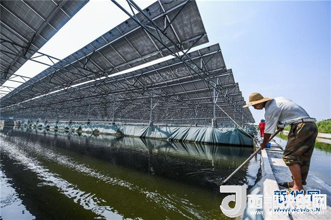 該項目建設(shè)在1800畝魚塘上,形成了板上發(fā)電、板下養(yǎng)魚的獨特景觀,項目裝機容量60兆瓦,所發(fā)電量全部并入電網(wǎng)。 近年來,浙江省湖州市大力實施能源項目,以太陽能、水能、風(fēng)能等清潔能源替代化石能源,因地制宜實施農(nóng)光互補、漁光互補、林光互補,不僅形成了一條集光伏發(fā)電、農(nóng)業(yè)種植、漁業(yè)養(yǎng)殖、林業(yè)休閑、旅游觀光于一體的生態(tài)旅游農(nóng)業(yè)光伏產(chǎn)業(yè)鏈,更有效推動了能源結(jié)構(gòu)的持續(xù)優(yōu)化,為湖州生態(tài)文明建設(shè)注入綠色動能。截至2018年6月底,湖州市新能源發(fā)電裝機達到145萬千瓦,比2017年同期增長40%;2018年上半年累計新能源發(fā)電量8.59億千瓦時,同比增長51%,相當(dāng)于減少煤炭使用量約34.7萬噸,減少二氧化碳排放約85.64萬噸。新華社記者 徐昱 攝
