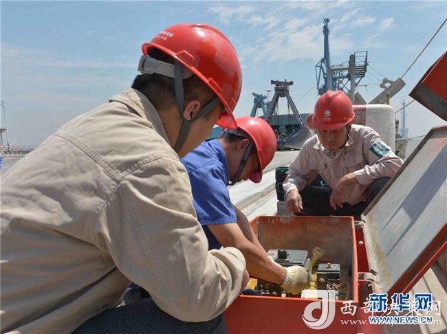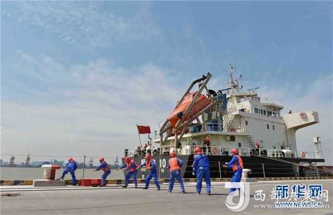 在長江岸線南通段一處港口碼頭,一艘貨輪錨定后,工作人員合力牽引岸電連接電纜(6月2日攝)。新華社發(fā)(李存根 攝)