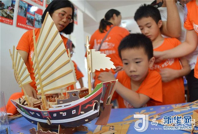 8月8日,“小候鳥”們與家長一起動(dòng)手拼接福船模型。