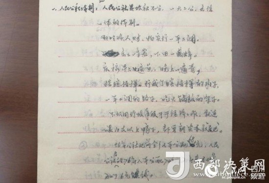 這本工作筆記內(nèi)頁(yè)紙上的字跡娟秀工整,細(xì)密地記錄著對(duì)人民公社的一些看法:“人民公社是政社不分、一大二公、五位一體的體制;出工一條龍,收工一窩蜂;不僅用行政手段干預(yù)經(jīng)濟(jì)工作,就連喂10只以上的鴨子都要割‘尾巴’……”。