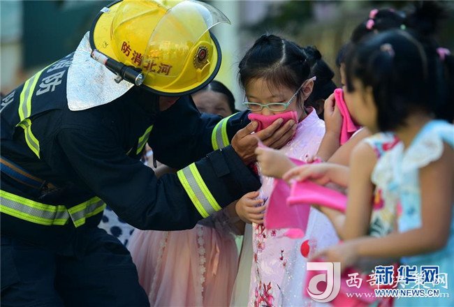 8月27日,滄州市公安消防支隊(duì)新華區(qū)建設(shè)大街中隊(duì)的消防戰(zhàn)士指導(dǎo)幼兒園的孩子從“著火”的校車(chē)中緊急疏散。