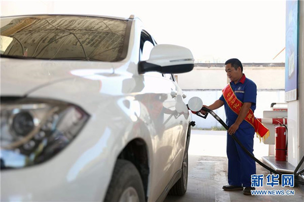 9月3日,河北省任縣一家加油站工作人員給車輛加油。 當日,國家發(fā)展改革委發(fā)布消息,按照現(xiàn)行成品油價格形成機制,自2018年9月3日24時起,國內(nèi)汽油、柴油價格每噸分別上調(diào)180元和170元。 新華社發(fā)(宋杰 攝)