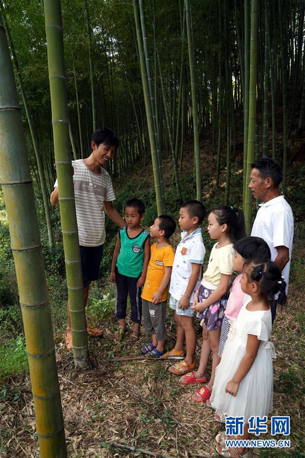 9月4日,黃文春(左一)和陳云根帶著學(xué)生們來(lái)到學(xué)校附近的山林,為孩子們講解竹子的生長(zhǎng)過(guò)程。  新華社記者 汪明麗 攝