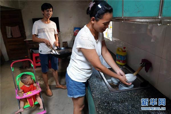 9月4日,在黃文春家中,黃文春和妻子歐陽(yáng)沙在廚房做飯。黃文春2011年與同學(xué)歐陽(yáng)沙結(jié)婚后,就把根扎在了蘆嶺,幾次放棄了考試進(jìn)城教書(shū)的機(jī)會(huì)。  新華社記者 宋振平 攝