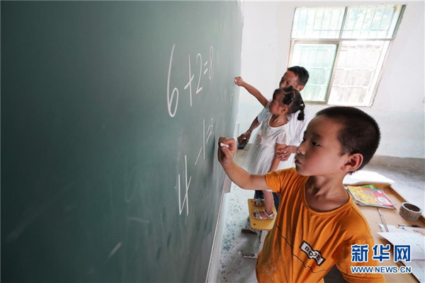 9月4日,在蘆嶺教學(xué)點(diǎn),陳云根在課堂上帶著孩子們做習(xí)題。  新華社記者 宋振平 攝
