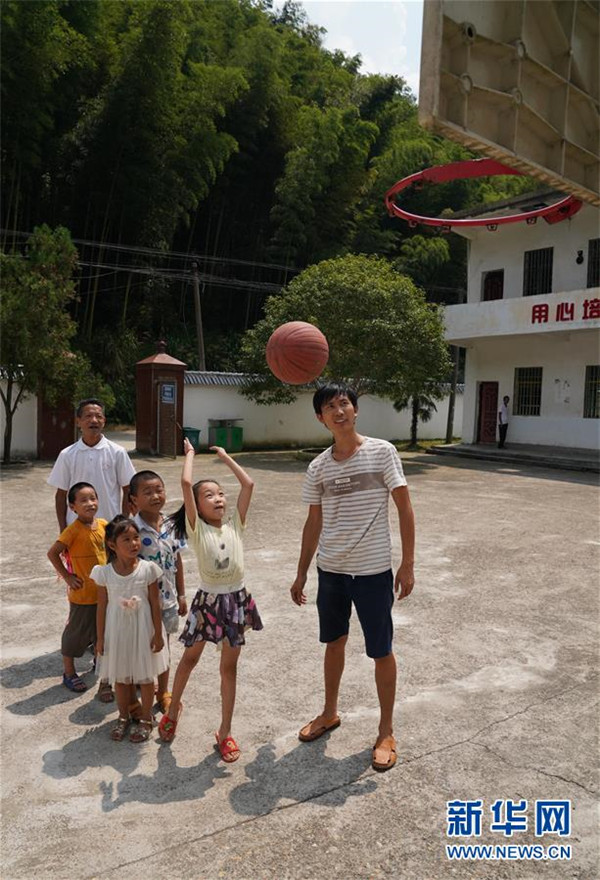 9月4日,在蘆嶺教學(xué)點(diǎn),陳云根(左一)和黃文春(右一)帶著孩子們上體育課。  新華社記者 宋振平 攝
