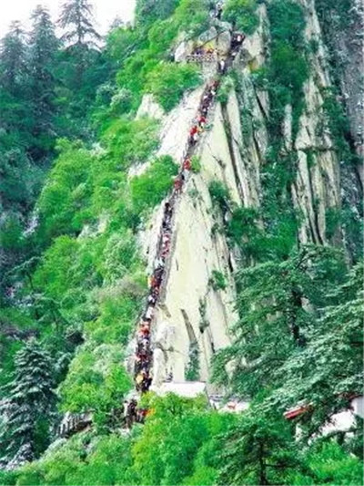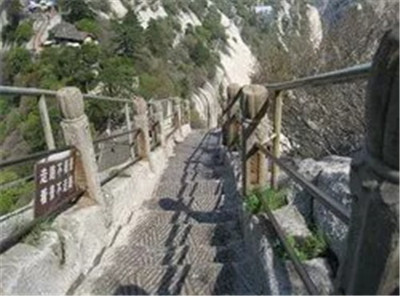 具有700多年歷史的長空棧道,在華山南峰東側山腰的萬仞絕壁上鑿出來的幾個踏腳之處,鑲嵌石釘搭木椽搭建了一個百余米懸空的棧道,讓人望而卻步,如果你有恐高癥,僅僅看一眼都會讓你驚恐萬分。2013年,著名旅游網(wǎng)站“Smarter Travel”盤點全球最恐怖懸崖步道,將華山長空棧道列為全球十大最恐怖的懸崖步道之一。