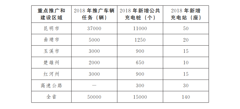 新能源汽車推廣的具體目標(biāo)為:重點圍繞私人購車、政府采購、公共出行、城市物流以及旅游等領(lǐng)域,在昆明市、曲靖市、玉溪市、楚雄州、紅河州等滇中城市群和重點旅游城市及景區(qū),2018年推廣5萬輛新能源汽車。其他州、市不下達(dá)推廣任務(wù),由州、市人民政府結(jié)合實際積極推廣新能源汽車。