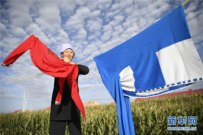 在中寧縣喊叫水鄉(xiāng)賀家口子村,村民金風花在晾曬衣服(9月6日攝)。新華社記者 王鵬 攝