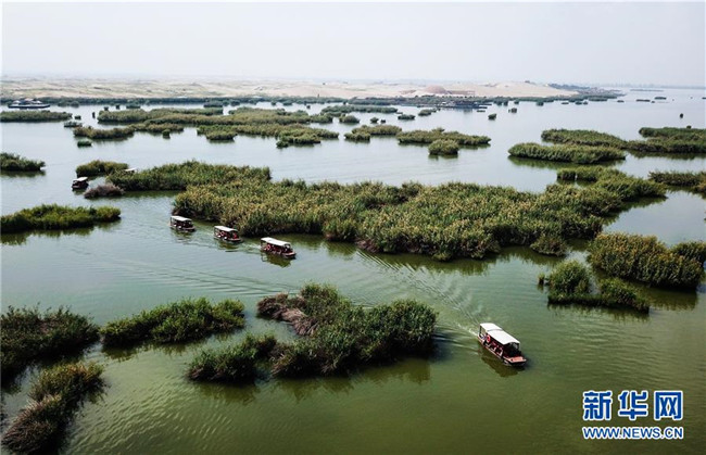 游客乘船在寧夏石嘴山市平羅縣沙湖景區(qū)游玩(9月12日無人機拍攝)。 寧夏,地處中國西北腹地。這里的大山、大河、草原、沙漠、湖泊,猶如一幅幅美妙畫卷,讓人流連忘返。 新華社記者 陳斌 攝