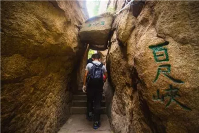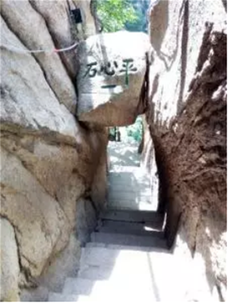過千尺幢就是百尺峽。說千尺幢艱險,是每個爬華山的人都能體驗得到的,而百尺峽就不是那樣的險要了。但當你上了百尺峽以后,眼前的一幕會讓人產(chǎn)生驚訝和不安。原來,在兩壁夾縫處有一塊懸石,似落非落的樣子,上面寫著“驚心石”三個字。人須從石下穿過,讓人不由得擔心它的穩(wěn)定性來,許多人產(chǎn)生畏葸不前的情緒來。待鼓足勇氣從石頭下走過去,回頭一看,又有“平心石”三個字在石頭上,才知是庸人自擾,虛驚一場。