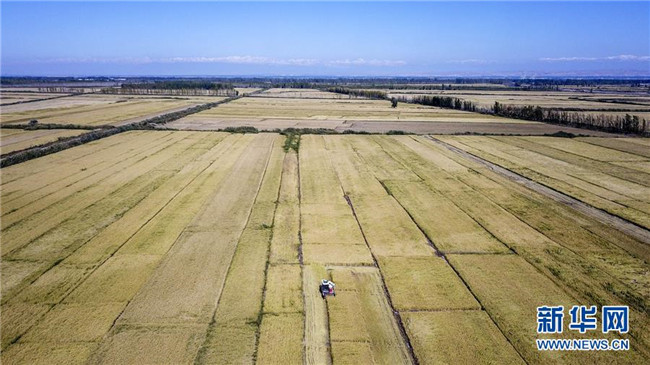 收割機(jī)在地處新疆察布查爾錫伯自治縣種羊場的“萬畝水稻優(yōu)質(zhì)高產(chǎn)高效示范區(qū)”收割水稻(9月26日無人機(jī)拍攝)。眼下,地處新疆伊犁河谷的察布查爾錫伯自治縣約20萬畝水稻迎來收割季。當(dāng)?shù)剞r(nóng)民搶抓農(nóng)時(shí),忙碌在金色田園中。記者 胡虎虎 攝
