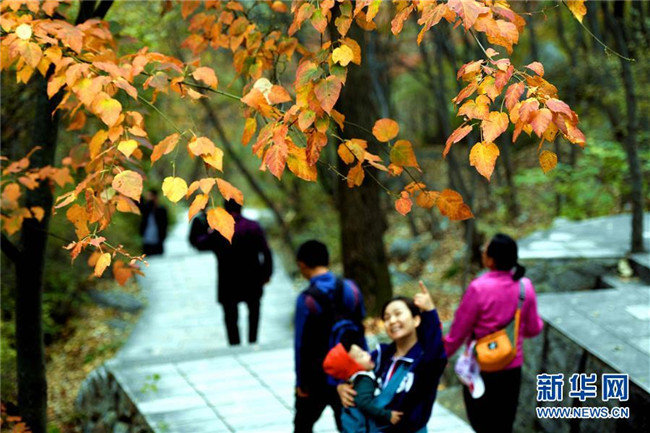 10月6日,游客在位于太行山東麓的靈壽縣五岳寨自然風景區(qū)內(nèi)觀賞紅葉。新華社發(fā)(陳其保 攝)