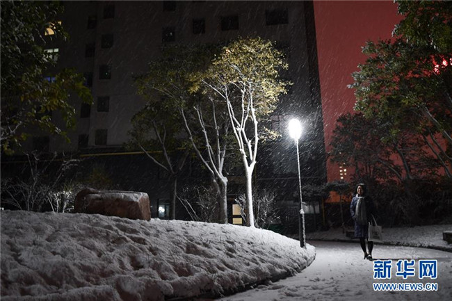 在青海省西寧市一小區(qū)內,一名市民在院內前行(11月3日攝)。 11月3日,青海省西寧市等地迎來降雪。 新華社記者 吳剛 攝