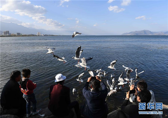 11月8日,游客在大理洱海畔觀賞紅嘴鷗。 初冬時(shí)節(jié),云南大理洱海湖水清澈,景色秀麗迷人。 新華社記者楊宗友攝