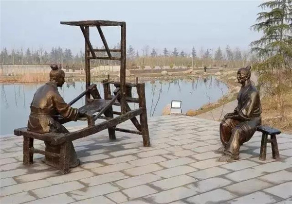 董永,相傳為東漢時期千乘人,年少喪母,因避兵亂遷居安陸。其后父親亡故,董永賣身至一富家為奴,換取喪葬費用。上工路上,于槐蔭下遇一女子,自言無家可歸,二人結(jié)為夫婦。女子以一月時間織成三百匹錦緞,為董永抵債贖身,返家途中,行至槐蔭,女子告訴董永:自己是天帝之女,奉命幫助董永還債。言畢凌空而去。因此,槐蔭改名為孝感。