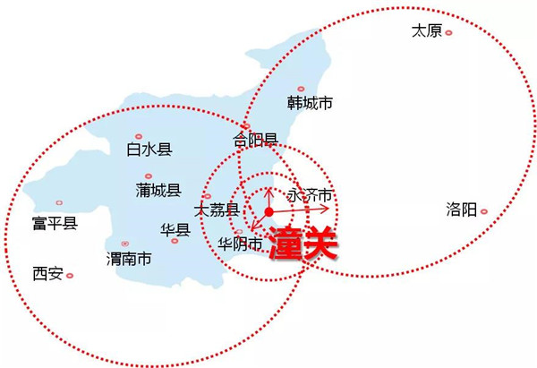 潼關(guān)地理位置優(yōu)越、歷史文化厚重,且居西安、太原、洛陽(yáng)三大城市經(jīng)濟(jì)輻射圈的中心。距華山約20公里。