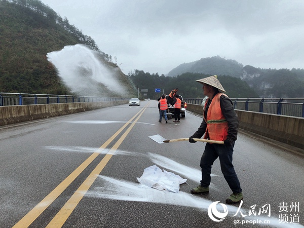 12月9日,在凱里爐山至下司快速通道,路政人員正在撒鹽除冰。潘文華 攝