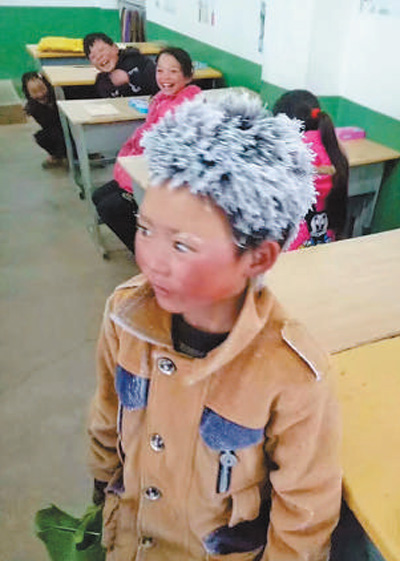 去年初,小滿因?yàn)轭^頂著冰霜上學(xué)而被稱為“冰花男孩”?!≠Y料圖片